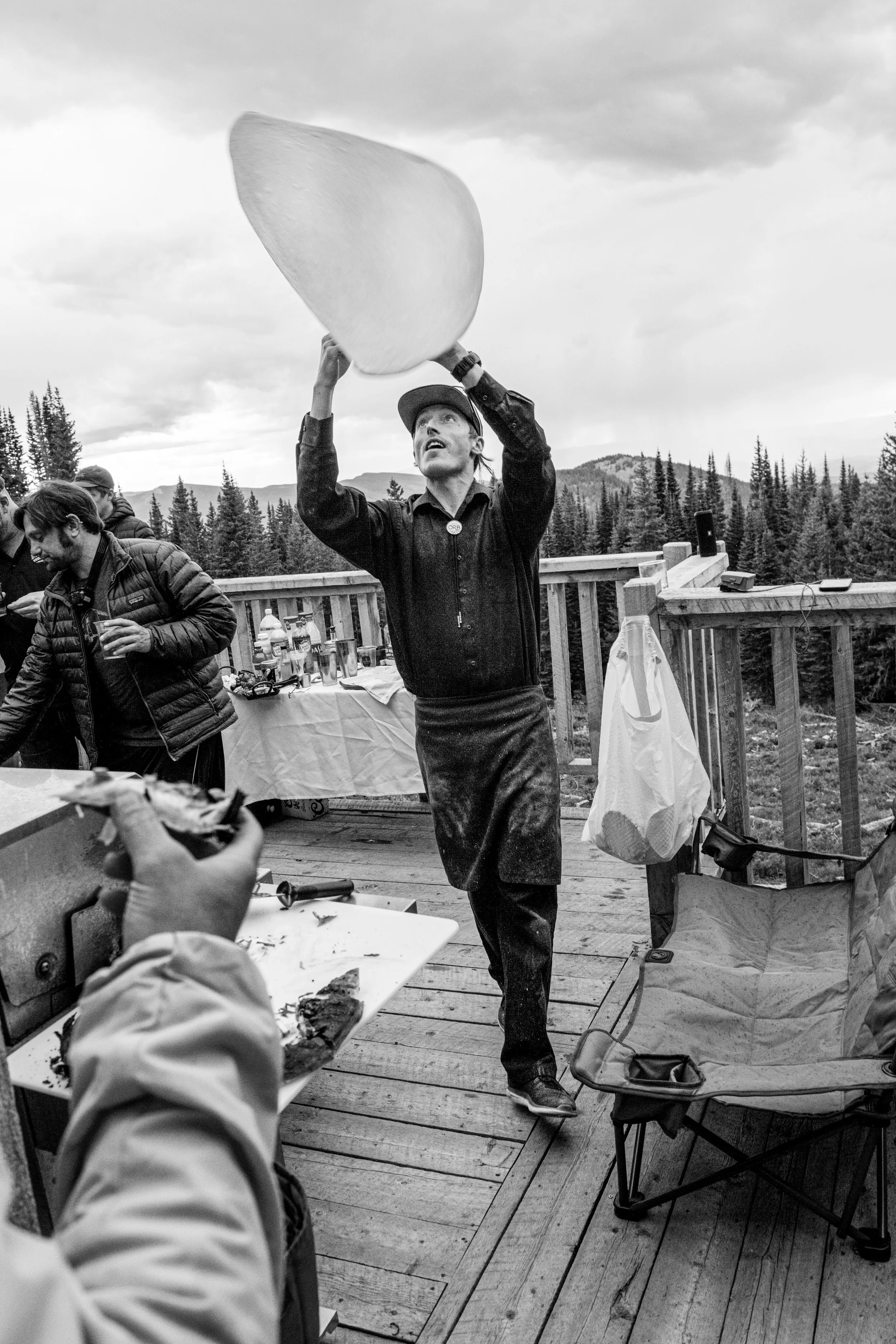 A person tossing pizza dough in the air on a wooden deck with a mountainous forest background.