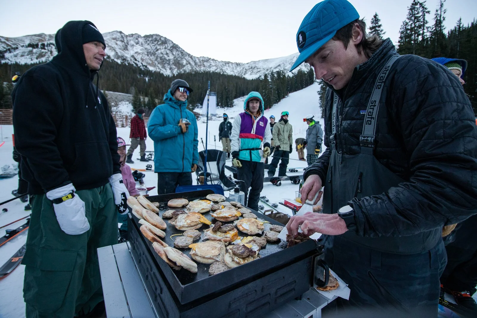 Group of skiers snowboarding and cooking breakfast sandwiches on a griddle at a snowy mountain resort.