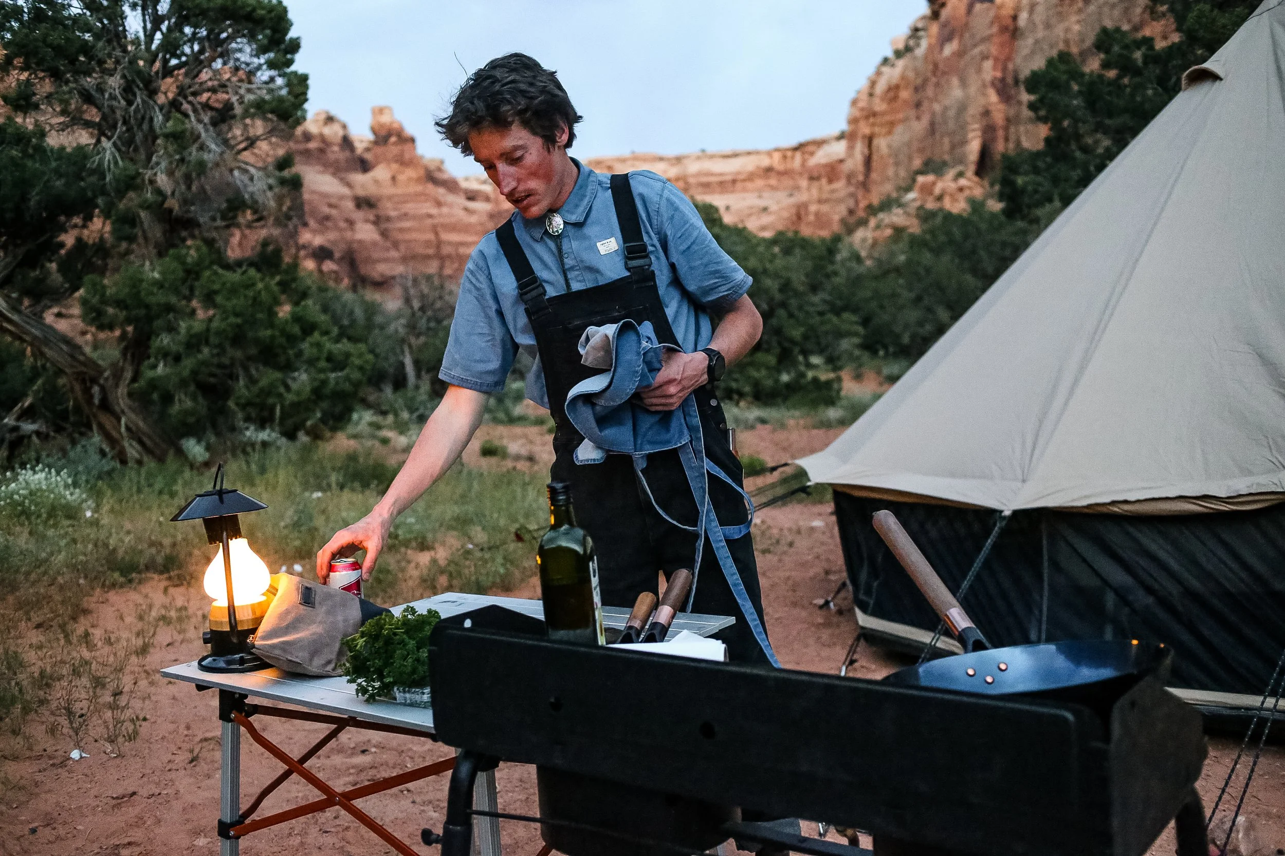 Person cooking at a campsite near a tent with a camping setup, including a table with a lamp, herbs, olive oil, cooking utensils, and a can.