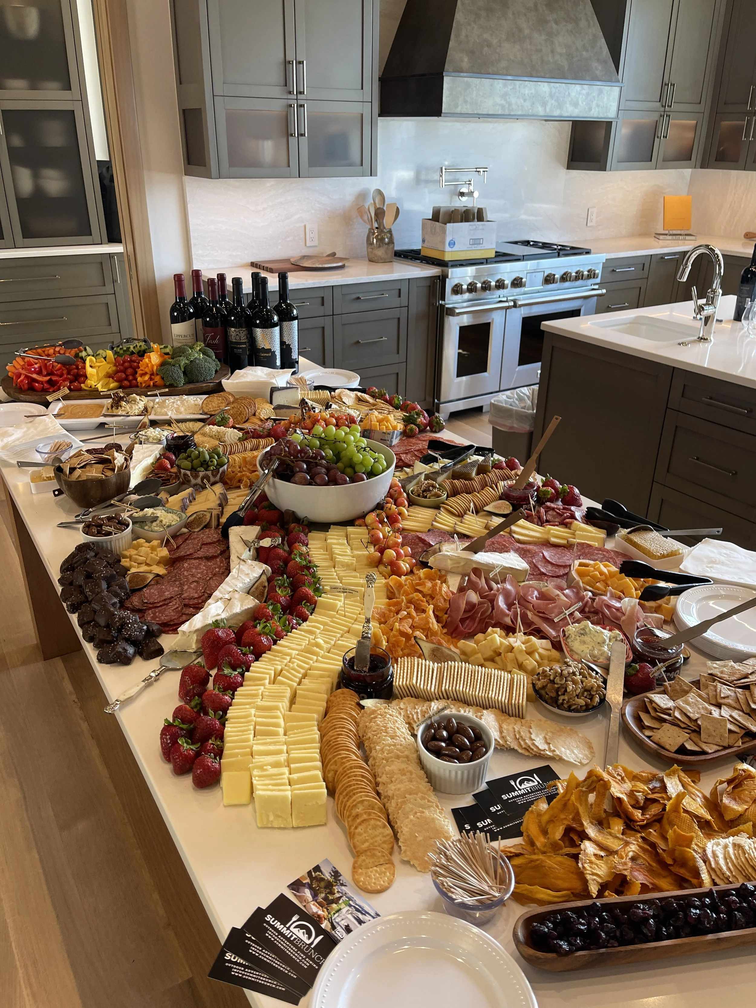 A large kitchen island filled with a variety of catering platters featuring cheeses, meats, fruits, crackers, and spreads. Bottles of wine are also displayed. The background shows modern kitchen appliances and cabinetry.