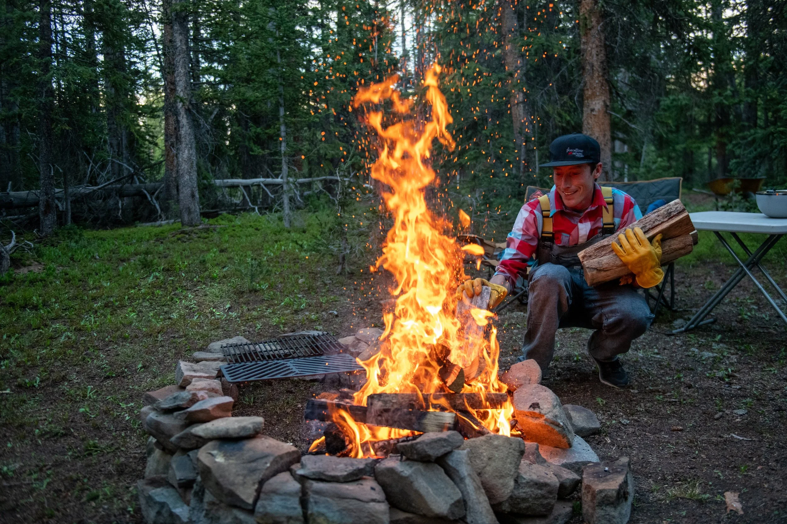 Person wearing a red plaid shirt and gloves tends to a campfire in a forest setting.