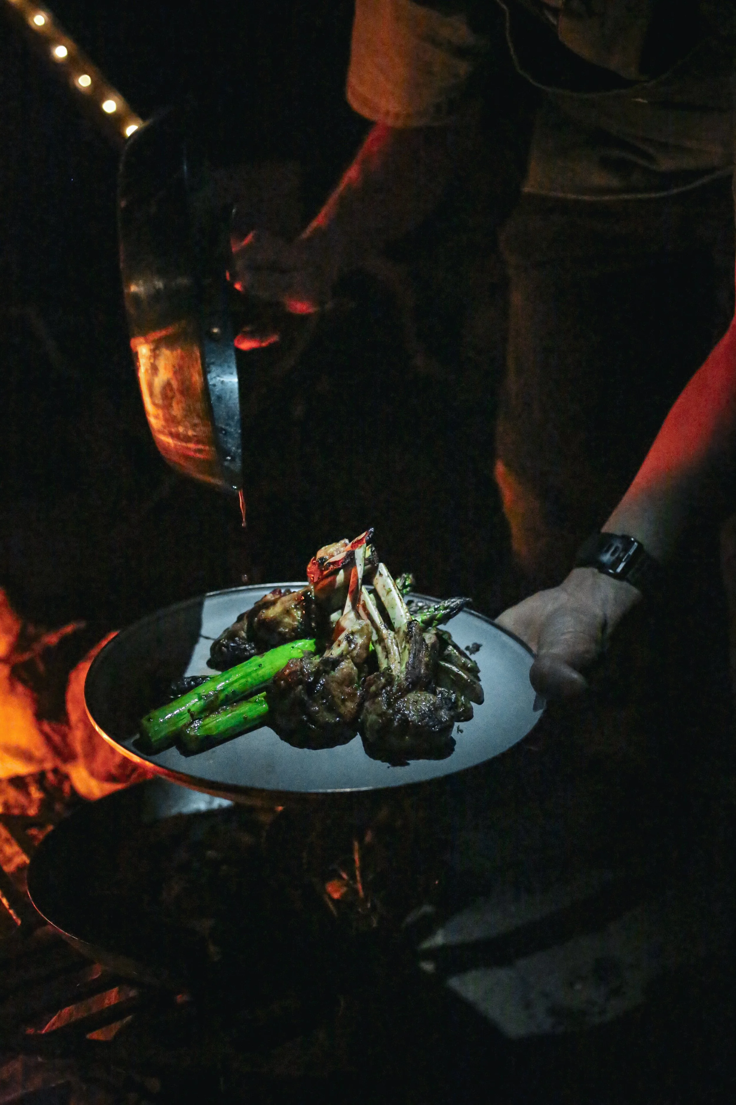 Person serving grilled meat and asparagus on a plate near an open flame at night.